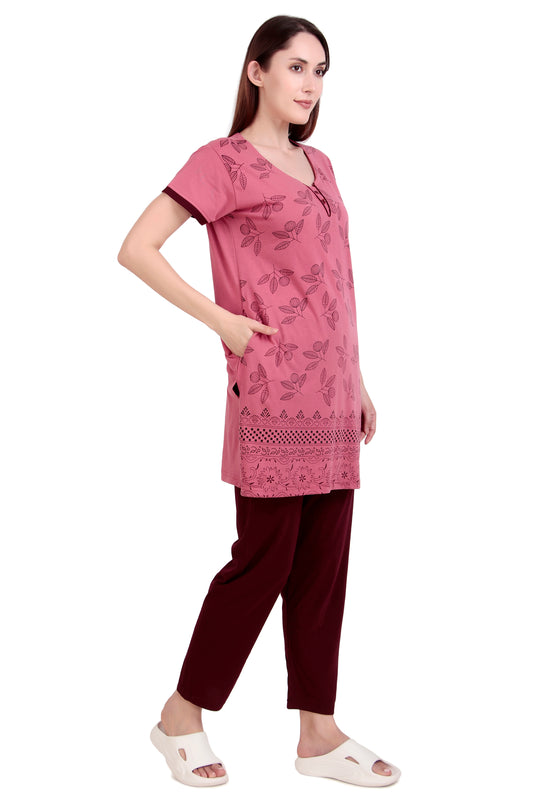 D-LINE Women's Cotton Nightwear Set – Long Top & Pajama with Buttoned Neck Design (#2950)